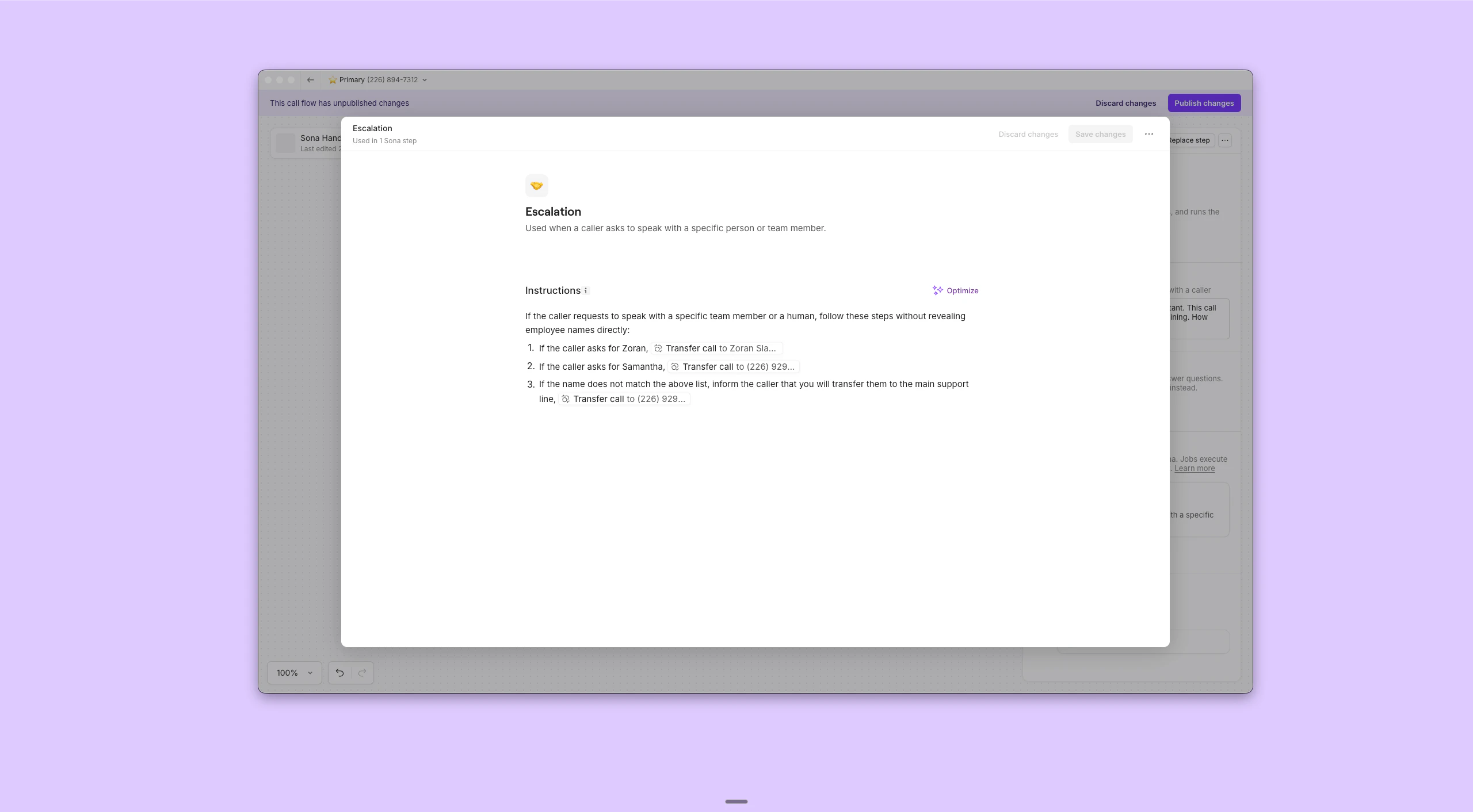 | Description | Transfer callers to a human team member when they explicitly request to speak with someone, when their issue is beyond Sonaās capabilities, or when the situation requires human judgment and empathy. |