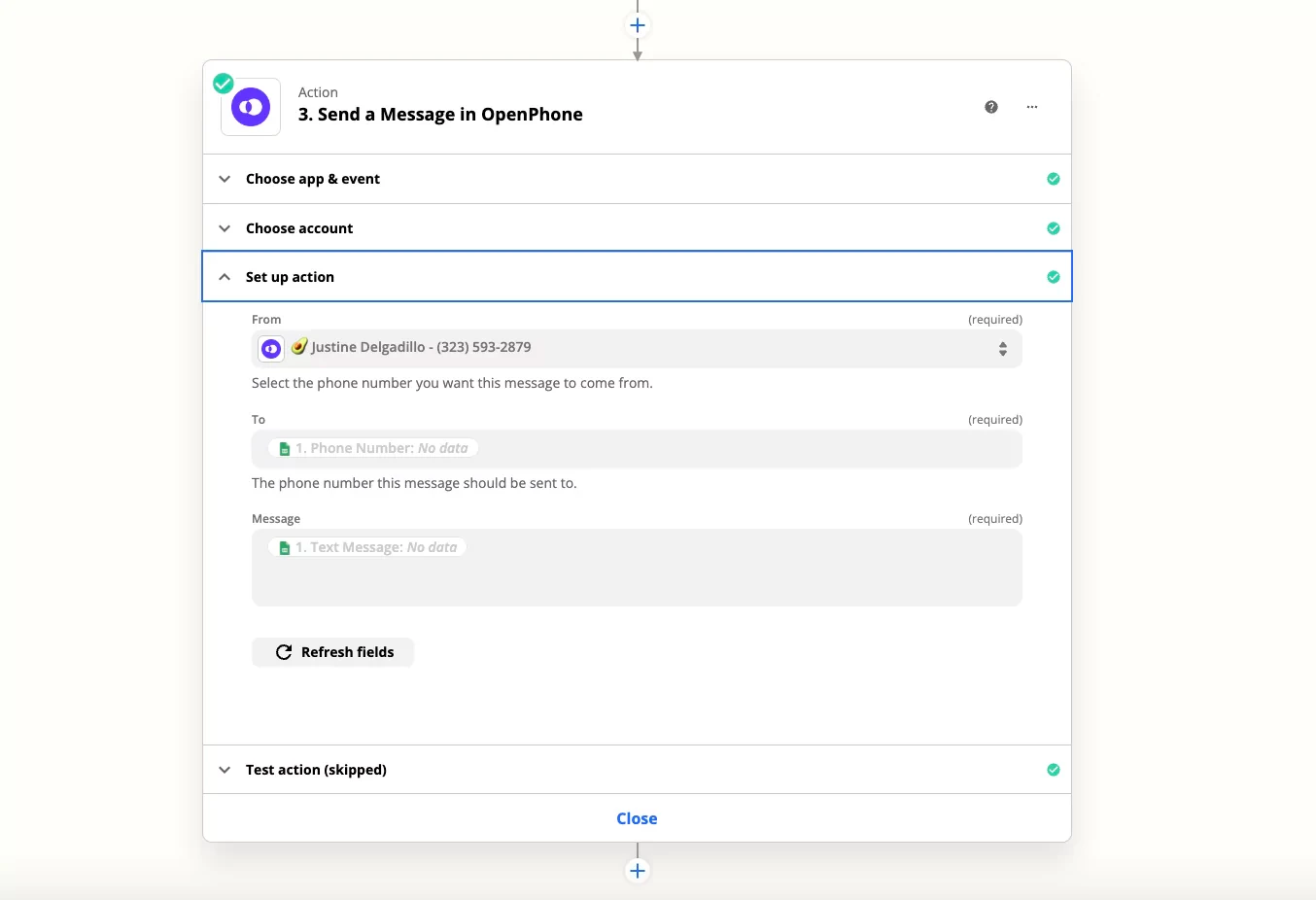 - Specify which phone number in your Quo account you wish to send texts from. In the âTo:â and âMessageâ fields, add the specific columns from your Google Sheet.